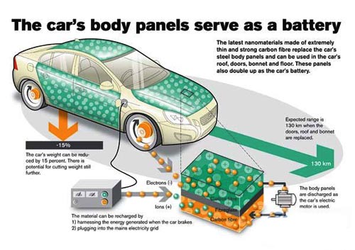 所開(kāi)發(fā)的這種復(fù)合材料將可提供極端強(qiáng)韌且可撓曲的特點(diǎn)。因此,它可被塑造成能用于打造車體覆板的形狀;同時(shí),重量也較現(xiàn)今的汽車電池更輕得多。根據(jù)Volvo汽車公司表示,如果能夠采用這種全新的復(fù)合材料來(lái)取代目前以鋼鐵打造的汽車車體,那么一部汽車的重量可再減輕達(dá)15%。