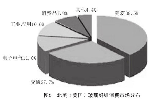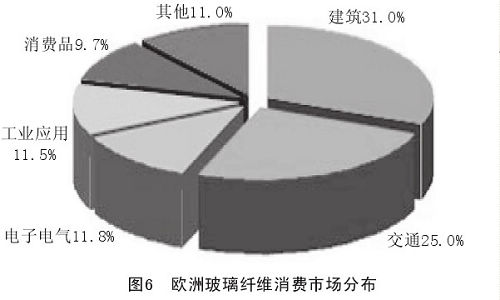 從我國和全球復合材料和玻璃纖維市場來看,建筑與交通運輸領域仍是最大的消費市場。新能源領域視為新興的消費市場,受到全球復合材料業界的關注。北美(美國)玻璃纖維消費市場分布如圖5所示,歐洲玻璃纖維消費市場分布如圖6所示,我國玻璃纖維消費市場分布如圖7所示。