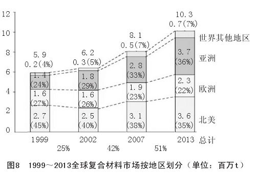 據JEC有關資料報導:世界復合材料將以年均6%的增速發展,而亞洲則以每年兩位數增長,亞洲復合材料占世界比例會從目前的36%增長到2015年的46%。全球復合材料市場按地區劃分如圖8所示。