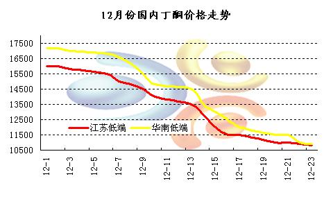 12月份國內國內丁酮主基調是下跌,從本月價格走勢圖中不難看出,以華東為例,月跌幅高達5500元/噸左右,下跌之勢迅猛。目前隨著價格逐步跌至底部,前期采取降價銷售的煉廠方面開始試圖改變這一操作模式,由降價出貨變為挺價銷售,挺價意向較為明顯。
