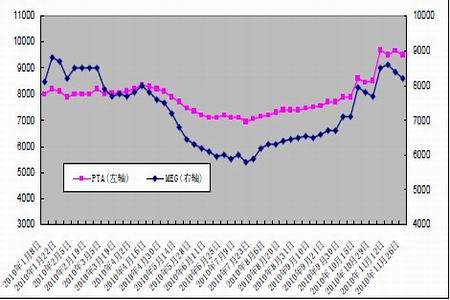 圖為PTA 現貨價格與MEG 價格走勢圖。(圖片來源:北京中期)