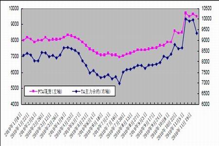 進入11 月份以來,PTA 現貨市場的變化節奏之快可謂讓人驚嘆,月初市場還沉浸在瘋狂拉漲的狂熱之中,但在進入11 月的第三周后,PTA 現貨市場卻已表現平淡。盡管當時下游產銷穩定,現貨貨源較少,但市場基本面的良好難抵經濟面的疲弱,受股市及大宗商品市場全線重挫拖累,部分商家風險意識增強開始放低出貨,力爭降低年末投資風險。PTA 現貨市場在前期暴漲中積累較多泡沫,加之月末下游旺季逐漸轉淡,在外圍出現調整波動時機,PTA 現貨市場也難逃整理命運。截止11 月29 日,華東PTA 現貨市場報盤意向9250 元/噸,遞盤9100 元/噸,實盤大致9150-9200 元/噸,較10 月30 日的報盤意向8500-8550 元/噸,試探性遞盤意向在8400-8450 元/噸,實質性商談大致8450-8500 元/噸,總體維持漲多跌少的格局。