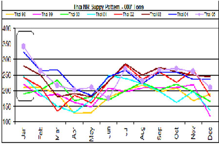 泰國天然橡膠月度產量情況