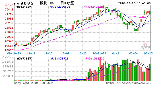 2月份由于春節放假,交易時間較短,回顧短暫的2月交易月份,橡膠走勢變化較大。初期,在宏觀政策不確定的影響下,滬膠延續1月份跌勢,下探到中期走勢的底部,但在22000元/噸處受到較強支撐。年前在宏觀暖風、周邊市場反彈的提振下,以及中國汽車銷售數據再創新高的推動下,橡膠再次顯示了強勢品種的特性,連續4日大幅收陽,節前最后一個交易日收盤于24374元/噸、春節期間紐約商業期貨交易所原油期貨3月合約走勢強勁,漲幅接近6美元,日本東京橡膠期貨7月主力合約也大幅上漲約11日元。另外LME金屬走勢也提振了市場氛圍,特別是LNE銅漲幅達到9%。受到外盤走勢提振,滬膠在節后第一天存在補漲的需要,站到了25000元/噸上方,但由于春季前中國人民銀行宣布再次提高存款準備金率0.5個百分點,以及美聯儲也將貼現率提高25個基點,宏觀政策上體現出的緊縮趨向,使橡膠走勢受到壓力,滬膠在25000元/噸處受到壓力,陷入震蕩走勢。