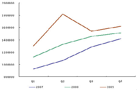 圖為2007-2009年季度塑料建材產值走勢圖。(圖片來源:Wind)