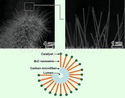 用掃描式電子顯微鏡得出的SEM照片顯示,在T恤衫纖維中結(jié)合了納米線陣列,圖表展示了交叉碳化硼涂層與碳微纖維交叉部分。