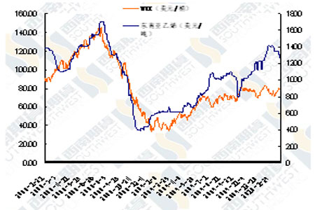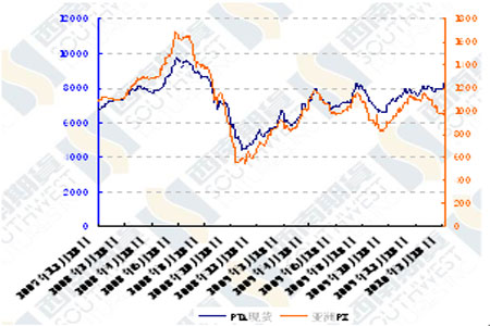圖為PTA現(xiàn)貨價(jià)格與亞洲PX價(jià)格走勢(shì)圖。(圖片來(lái)源:西南期貨)