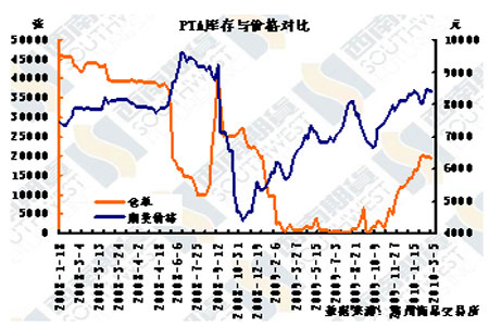 圖為PTA庫存與價格走勢圖。(圖片來源:西南期貨)