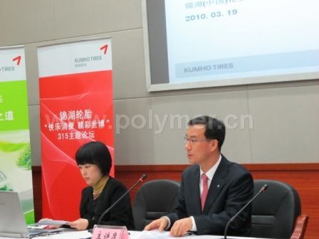 錦湖輪胎作為融入中國社會、有著強烈社會責任感的企業(yè),為了給消費者提供最好的產(chǎn)品,近年來一直致力于加快環(huán)保輪胎的研發(fā)與應(yīng)用,旗下的幾款環(huán)保型輪胎一經(jīng)問世,就廣受政府機構(gòu)及業(yè)界的肯定。在論壇的發(fā)言中,吳東圭同時還透露:“錦湖最新研發(fā)的科技成果,將會在世博的韓國企業(yè)聯(lián)合館中展出。”