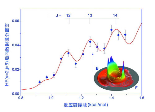 實驗測量到的F+HD反應中后向散射HF(v=2,j=6)產(chǎn)物強度隨碰撞能量的變化(實圓點)。紅實線是理論計算的結果。觀測到的三個振蕩峰被歸屬為J=12,13,14的分波共振。圖中的三維圖是在1.285kcal/mol碰撞能下HF產(chǎn)物在各個方向的散射微分截面圖。B代表后向散射方向,F(xiàn)代表前向散射方向。