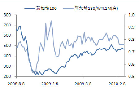圖為新加坡180CST現(xiàn)貨價格走勢圖。(圖片來源:Bloomberg,卓創(chuàng)資訊,海通期貨研究所)