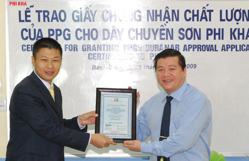 PPG亞太區(qū)工業(yè)涂料總經(jīng)理吳春平(左)向PHI KHA公司主席兼總經(jīng)理Nguyen Phi Kha先生頒發(fā)授權(quán)證書(shū)
