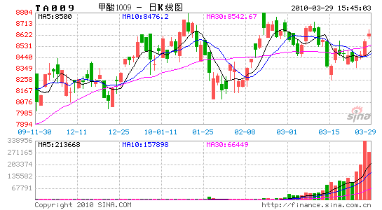PTA:本周PTA主力合約自1005逐步轉(zhuǎn)移至1009合約上,PTA1009合約價(jià)格周一至周四基本在8300-8500元之間徘徊,并且盤中價(jià)格區(qū)間震蕩范圍很小,然而,本周五的一根大陽(yáng)線似乎使PTA有短期擺脫震蕩區(qū)間的跡象。我們從1009合約K線圖中看出,周五價(jià)格曾突破前期高點(diǎn),可遺憾收盤價(jià)格略有回落,但這并不影響對(duì)短期內(nèi)PTA可能會(huì)形成小反彈。