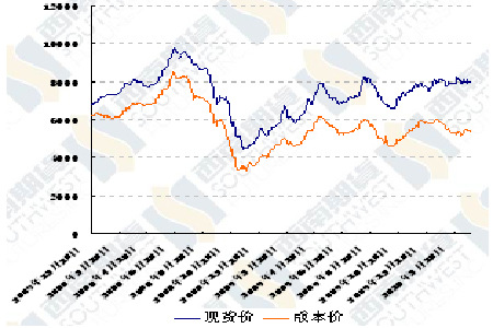 圖為PTA現(xiàn)貨價格與成本價走勢圖。(圖片來源:西南期貨)