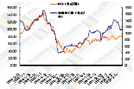 圖為WTI原油與東南亞乙烯走勢圖。(圖片來源:西南期貨)
