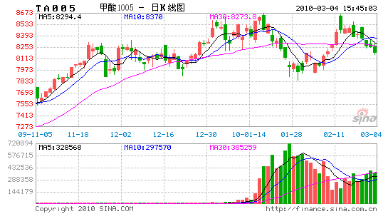 2月份,PTA價格在原油價格大幅反彈影響下,鄭州期貨指數價格盤中創出09年以來新高。主力TA005期價從1月末收盤的8040元/噸一路上漲至盤中最高價8648元/噸,最高共計上漲608元/噸,漲幅為7.56%。