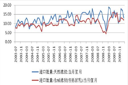 圖8:中國天然橡膠和合成橡膠進口量對比