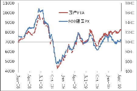 圖1、國產(chǎn)PTA、PX價(jià)格