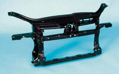 LFT-D壓制成型制品的抗沖擊性能比GMT略低,但由于比LFT-G成型后的纖維長很多,因此其抗沖擊性能明顯高于LFT-G。另外,據大量的研究表明,LFT-D注塑的生產率比標準的LFT-G粒料高,因為LFT-D低的塑化要求改善了纖維發生斷纖的狀況。對于成型周期超過1min的部件用LFT-D注塑設備在30s內就能完成。下圖為使用 LFT-D生產的2003 大眾 Golf V前端框架。
