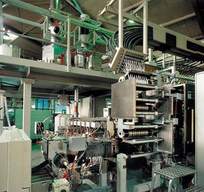 LFT-D典型的工藝是聚合物基體顆粒和添加劑被輸送到重量分析給料單元組合中,該單元根據部件的機械性能要求確保適度的混合。經混合后的原料進入雙螺桿擠塑機塑化,其熔融化合物通過一個薄膜模頭形成類似瀑布的聚合物薄膜,直接進入雙螺桿混煉擠塑機的開口處。而玻璃纖維粗紗則通過特別設計的粗紗架,經過預熱、分散等程序被引入到聚合物薄膜的頂端,與薄膜匯合一同進入到雙螺桿擠塑機中,由螺桿切割粗紗,并把它們柔和地混合到預熔的聚合物當中,然后直接送入壓制模具中成型(見下圖)。