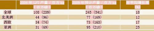 可以說,LFT是汽車復(fù)合材料工業(yè)中的希望之星。美國Principia咨詢公司的市場報告顯示(見下表),2004年全球LFT市場需求量約為1.08億kg(2.39億磅),銷售額為4.5億美元。LFT完全可以替代汽車業(yè)、工業(yè)以及園林草坪業(yè)中的壓鑄件、鋼質(zhì)沖壓金屬件以及短玻纖增強熱塑性復(fù)合材料件,但是目前汽車行業(yè)仍然是LFT主要的應(yīng)用領(lǐng)域。汽車中應(yīng)用LFT的零部件主要包括:前端模塊框架、車身底護板、儀表臺骨架、蓄電池托架、備胎倉、外罩、抗沖構(gòu)件及其他。總體上看,2004~2009年LFT的市場預(yù)計增長率平均可達18%,其中亞洲的增長率最為強勁,約為25%;西歐和北美洲的增長率預(yù)計分別可達17%和12%。