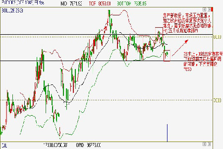 從技術(shù)分析角度看,4 月末中K 線下穿布林帶下沿,短期存在向上回補的可能。中期來看布林帶仍處于一個橫盤整理狀態(tài),難有大幅上漲或下跌機會。從圖形上看,下方7700一線支撐強勁,下行空間有限。