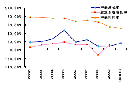 08 年以來PVC 行業(yè)發(fā)展進入相對飽和期,產(chǎn)業(yè)擴展空間相對縮小,生產(chǎn)增長率下滑至9.26%。09 年雖有所回升但仍低于2003-2007 年的平均水平。