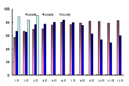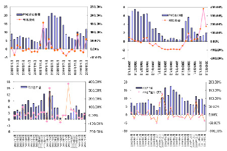 自2009 年6-12 月份,PVC 產量總體較為穩定,維持80 萬噸左右,遠高于于1-5 月份同期產量,顯示整個PVC 行業恢復良好,進入生產穩定期。2010 年3 月份國內聚氯乙烯產量為90.6 萬噸,環比增加8.24%,較去年同期增加16%;1-3 月累計產量為263.5 萬噸,較去年同期增加20.2%。