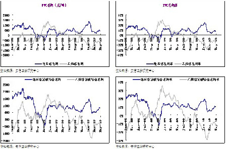 從成本角度來看,1 月份以來PVC 現貨價格長期位于成本線附近徘徊,生產企業利潤有限,3 月中旬后隨現貨價格小幅上移,生產企業微利狀況有所改觀。按目前原料價格測算 PVC 生產成本大約在6900-7200 之間。電石法生產企業處于09 年以來利潤較為豐厚的時期,乙烯法企業則仍處于成本倒掛中。