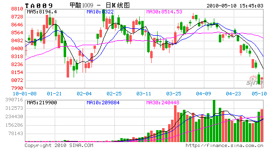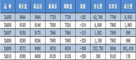 鄭商所主力合約TA1009呈單邊連續(xù)下挫的局勢,開盤價8372,周中一度震蕩走弱,最高8404,最低8030,周五跳空低開后持續(xù)下跌,最終收于8036,周跌306點,持倉量203750手,成交量801434手。