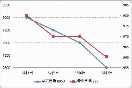 本周亞洲PTA現貨市場呈弱勢下行走勢,價格由周初的985-990美元/噸到本周五下午的960-965美元/噸CFR中國(L/C90天),周跌幅為25美元。五一過后,PTA期貨大幅回落,PTA現貨市場行情平淡下滑,臺產貨零星報盤990美元/噸。周中,受原油大幅 跳水,PTA期貨同步跳空低開,PTA現貨市場 氣氛低迷。臺產貨商談在970-975美元/噸左右。臨近周末,期貨臨近跌破8000,市場觀望氣氛濃厚,市場遞報盤稀少。雖然下游滌絲銷售仍處于旺季,不過PTA市場疲態顯露,繼續上漲的動力不足。