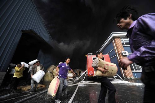 工人搶救工廠物資