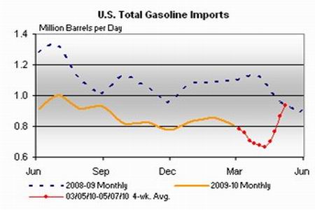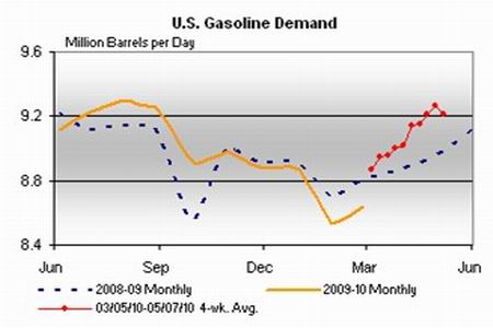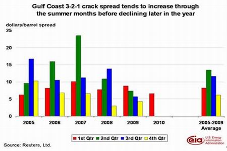 從圖中可以看出,今年一季度的裂解價差小于去年一季度,而根據美國能源信息協會5月份的報告,今年二季度美國汽油價格將平均上漲0.07美元/加侖,而過去五年(2005-2009)二季度汽油價格的平均年漲幅為0.18美元/加侖。因此,在裂解價差變小的情況下,汽油價格上漲幅度較小,這樣也會抑制原油價格的上漲幅度。