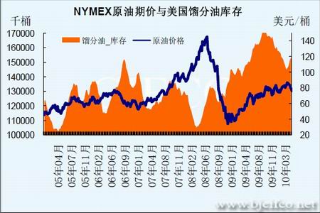 圖為NYMEX原油期價(jià)與美國餾分油庫存走勢圖。(圖片來源:北京中期)