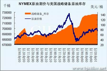 圖為NYMEX原油期價(jià)與美國戰(zhàn)略儲備原油庫存走勢圖。(圖片來源:北京中期)