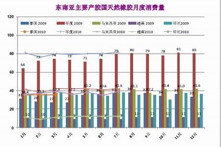 在ANRPC中,中國、印度和馬來西亞三國的天然橡膠消費量是最大的,這三個國家的需求量之和占全球天然橡膠總需求量的45%左右。2010年的前四個月,這三國天然橡膠的進(jìn)口量和消費量均出現(xiàn)了較大幅度的增長。2010年1至4月份,中國、印度和馬來西亞三國天然橡膠消費量按年率計算分別同比增加了25.5%、11.7%、13.6%。