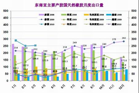 2010年以來,除中國以外,ANRPC各成員國天然橡膠供應(yīng)量同比均有所增加,雖然增長幅度各不相同。泰國2010年1-3月份天然橡膠產(chǎn)量為84.8萬噸,較2008年同期(68.1萬噸)大增24.5%;印尼2010年1-2月份天然橡膠產(chǎn)量為41.4萬噸,較2008年同期(38.9萬噸)增加6.4%;馬來西亞2010年1-4月份天然橡膠產(chǎn)量為33.25萬噸,較2008年同期(24.33萬噸)大增36.7%,5到7月份預(yù)計總產(chǎn)量24.6萬噸,同比增加10.2%;印度2010年1-4月份天然橡膠產(chǎn)量為26.05萬噸,較2008年同期(124.0萬噸)增加8.5%,5到7月份預(yù)計總產(chǎn)量17.7萬噸,同比增加12.0%,越南2010年1-4月份天然橡膠產(chǎn)量為11.13萬噸,較2008年同期(8.94萬噸)增加24.5%,5到7月份預(yù)計總產(chǎn)量17.28萬噸,同比減少6.6%,中國2010年1-4月份天然橡膠產(chǎn)量為6.24萬噸,與2008年同期(6.23萬噸)相比增加了0.2%,5到7月份預(yù)計總產(chǎn)量22.9萬噸,同比增加3.2%,斯里蘭卡2010年1-4月份天然橡膠產(chǎn)量為5.68萬噸,較2008年同期4.94萬噸)增加15.0%,5到7月份預(yù)計總產(chǎn)量4.35萬噸,同比增加45.5%,柬埔寨2010年1-4月份天然橡膠產(chǎn)量為1.13萬噸,較2008年同期(0.82萬噸)增加37.8%,5到7月份預(yù)計總產(chǎn)量1.10萬噸,同比增加57.1%。