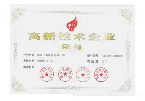 近日,浙江飛鯨漆業有限公司獲得浙江省科技廳、浙江省財政廳、浙江省國家稅務局、浙江省地方稅務局聯合頒發的《高新技術企業證書》(證書編號:GR200933000888)。