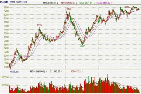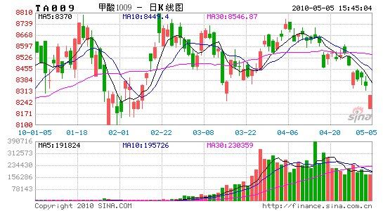 四月份的前三天,在紡織品內銷強勁,出口穩步回升的帶動下,PTA快速沖高,并創出反彈的新高8672點后,在貨幣緊縮加劇的影響下,開始震蕩回落。希臘債務危機的陰影揮之不去及高盛欺詐一案令市場做多信心倍受打擊,PTA也無力走高,只能在8600——8400的狹小空間內震蕩整理。近期內有考驗短期上升趨勢線(2月1日與3月16日低位連線)支撐力度的要求。