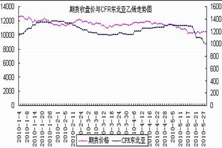 2、 期貨收盤價與CFR東北亞乙烯走勢圖