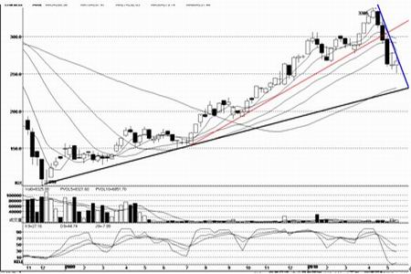 從周K線圖形看:目前周K線已經向下連續突破了5周、10周、30周均線,形成了中級下跌調整的跌勢,受到藍色壓力的壓制,向下繼續尋找支持。上升的兩條趨勢線里面,中期上升趨勢線(紅色)在月初已經被下破,目前價格正向2008-2009年低點構成的長期上漲趨勢運行,該價格與60周均線接近在230-240日元一線。