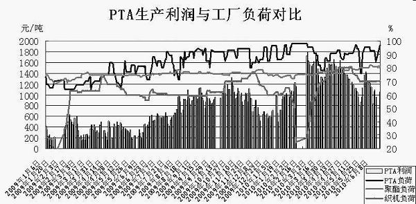 如上文所述,PX下跌幅度遠大于PTA,生產成本大幅下降顯著提升了國內PTA工廠生產利潤空間。在豐厚利潤的驅使下,國內PTA廠家生產積極性高漲。據統計,2010年上半年國內PTA工廠負荷長期維持在90%以上的水準,甚至一度逼近滿負荷運行,高生產利潤對于國內PTA工廠負荷提升的刺激力度顯而易見。