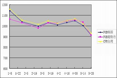 截止5月28日,FOB韓國的報價為912.5-913.5美元/噸,CFR臺灣的報價為930.5-931.5美元/噸,FOB鹿特丹的報價為908-912美元/噸,相比四月底FOB韓國的報價1047.5-1048.5美元/噸、CFR臺灣的報價為1065-1066美元/噸、FOB鹿特丹的報價為1052.5-1056.5美元/噸,分別下跌135.5美元/噸、134.5美元/噸、144美元/噸。而PTA現貨的采購減少,對于PX價格反彈的形成制約。
