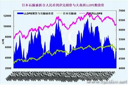 圖為日本石腦油與LLDPE期貨價(jià)走勢(shì)對(duì)比圖。(圖片來源:文華財(cái)經(jīng)、北京中期)