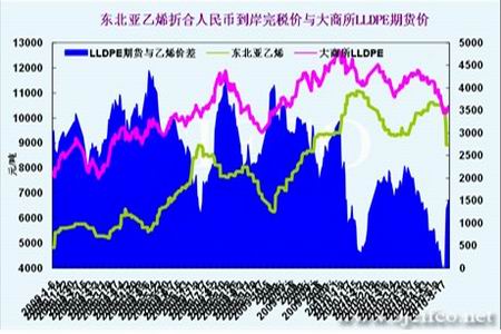 圖為東北亞乙烯與LLDPE期貨價(jià)走勢(shì)對(duì)比圖。(圖片來源:文華財(cái)經(jīng)、北京中期)