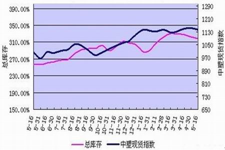 圖為塑料總庫存與中塑現(xiàn)貨指數(shù)變化對比圖。(圖片來源:中塑資訊)