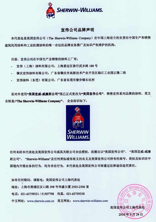 本代表處是美國宣偉公司(TheSherwin-WilliamsCompany)在中國上海設立的負責在中國生產和銷售建筑民用涂料和工業防腐涂料的唯一合法的品牌業務推廣及知識產權維護的機構。
