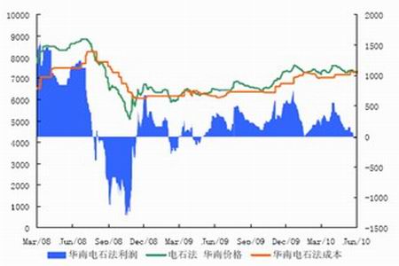 圖為華南電石法PVC成本與利潤(rùn)走勢(shì)圖。(圖片來(lái)源:中期研究)