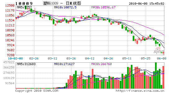 1、2010年4月16是個極具紀念的日子,既是中國股指期貨上市為股市提供做空機制的金融紀念日子,也是高盛欺詐門事件爆發,引發資本市場玉樹般大地震,大宗商品暴跌的日子;緊接著國內房產調控政策的出臺,拉開了國內股市大幅下跌的序幕;隨后歐洲債務危機全面升級,引發歐元匯率一路下挫,市場恐慌情緒更是雪上加霜地蔓延,資金紛紛回流美國,尋求美元避險,使得美元一路高歌猛進,國際原油一瀉千里直線下跌,價格一度擊穿70美元,創下了近三個月以來的新低。全球宏觀經濟環境在夏季寒氣逼人,也使得塑料順利完成了頭肩頂形態發展,到達目標價位1萬元附近,但5月21日德國投票通過支援希臘財務危機方案之后,大宗商品止跌反彈,但塑料順利突破10400壓力位,在進口量和國內產能產量增加的重壓之下,反彈之路猶如曇花一現,受到10400重壓,塑料重壓之下尋找方向何去何從?