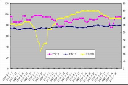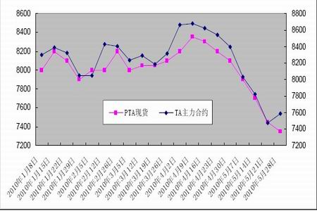 外圍資本環境不斷出現利空新政,國內調控房市的力度加大、澳大利亞再度加息,市場人士對希臘債務擔憂揮之不去,歐美股市下跌,美元兌歐元匯率上升,原油期貨從19 個月以來最高位回跌。受此拖累,國內股市及大宗商品期貨市場展開了一波震蕩向下的行情,現貨市場同樣遭遇重創,月累計下跌700 元/噸,幅度達8.7%。中石化及主要PTA 供應商5 月份結算在7800 元/噸,較4 月份結算下滑550 元/噸,6 月份掛牌價格在7800 元/噸,較5 月份結算持平。五一節后,中國人民銀行決定自5 月10 日起,上調存款準備金率0.5 個百分點至17%,此舉對大宗商品期貨市場形成一定打壓,現貨市場承壓,業內人士平淡觀望,內外盤雙雙小幅下挫。此后市場基本維持下滑態勢,截止5 月28 日,華東PTA 現貨市場零星報盤意向在7350 元/噸,實盤意向大致7300 元/噸;外盤船貨市場行情同樣跟漲,臺灣貨及保稅貨報價875 美元/噸附近,韓國貨源報盤855 美元/噸附近,實盤大致845-870 美元/噸,買家意向謹慎,實盤依然稀少。